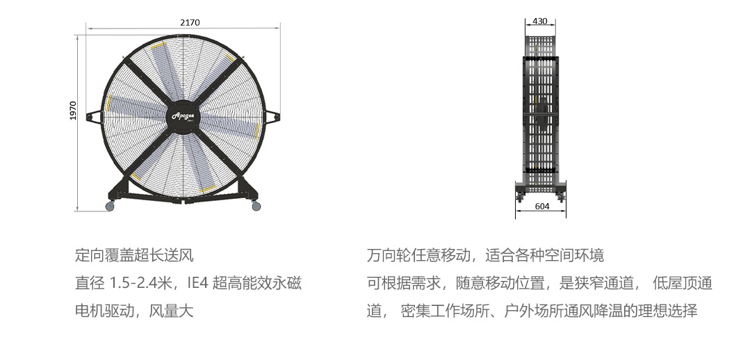 MDM 系列是移動式大風(fēng)扇, 適用于一些特定場所由于空間受限不能頂部安裝大風(fēng)量低轉(zhuǎn)速吊扇, MDM 是一個較為理想的解決方案, 產(chǎn)品適合于狹窄通道, 低屋頂通道, 密集工作場所,或需要特定風(fēng)量的應(yīng)用場所。